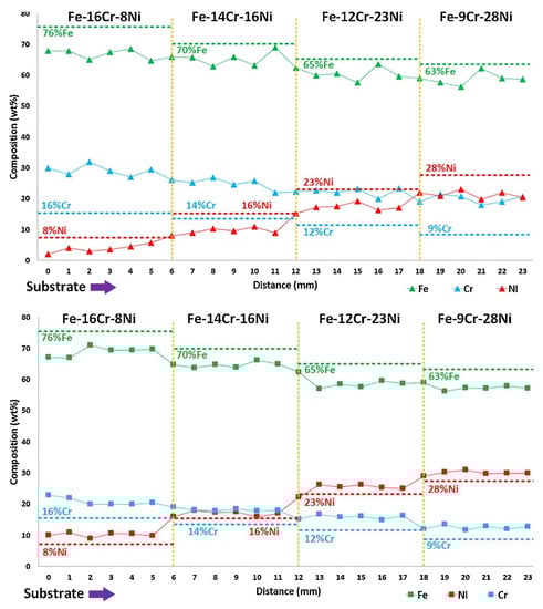 Element composition control of Fe-Cr-Ni FGM with un-sieved (the upper figure) and sieved (the lower figure) elemental powder mixture. The FGM fabricated by sieved powder mixture gives more accurate composition [74]. The percentage indicates wt.% in this figure. (Reproduced with permission from Elsevier).
