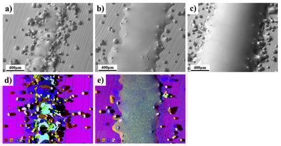 Therefore, apart from the flow properties of powder particles, the thermal interactions are also complex, which may affect the composition, microstructure, and performance. Metal elements cover a wide range of physical properties such as density, melting point, and laser absorption rate. For instance, among engineering structural alloys, the melting point can span from 600 °C in Al to 3400 °C in W [91]. The energy absorption rate is also worth considering when a highly reflected element, such as Cu, is part of the alloy [98]. In SLM work, a refractory HEA comprises of NbMoTaW was deposited [99]. A 3.5% composition deviation was found. Although the element composition of 5%–35% can all be regarded as HEA, how this deviation can affect the phase evolution and the final properties are still unknown at this moment. In [90], a new processing of DED was applied to deposit a functionally graded refractory HEA, which includes a wide range of melting points. The newly designed process route consists of a low power step to yield low powder evaporation and a high power step to remelt the previous layer and homogenize the elements. In Figure 9, Figure 9a,b are single track deposition and deposition track after the second remelting step, respectively. Figure 9d,e are EDS mapping of elements (Zr, Nb, Ti, Ta, and the substrate Mo) of Figure 9a,b respectively. From the EDS mapping, it can be seen that the remelting step strongly homogenizes the refractory elements within the entire deposition.
