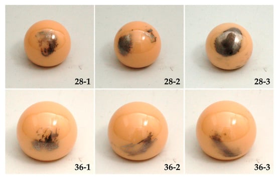 Retrieved alumina femoral heads with shiny metallic areas were used (Figure 1) for a hip wear simulator test. Three femoral heads that were 28 mm in diameter and three femoral heads that were 36 mm in diameter, made of alumina (Al2O3) with metallic markings, were selected. In order to ensure comparable ceramic femoral heads for the study, heads with similar distributions and areas of metallic depositions were selected from the retrieval archive of our hospital. The retrieved ceramic heads were part of uncemented implant systems combined with polyethylene liners used as a bearing partner. The implantation period of the 28 mm heads was between 303 and 4769 days and between 51 and 192 days for the 36 mm heads. For the hip wear simulator, the selected retrieved ceramic heads (Figure 1) were combined with new cross-linked ultra-high-molecular-weight polyethylene liners in combination with uncemented acetabular cups (Trident X3, Stryker GmbH & Co. KG, Duisburg, Germany) with an outer diameter of 56 mm. The study was approved by the Ethics Committee of the University of Rostock (registration number A 2017-0141).
