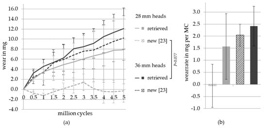 Mean gravimetric wear of the sequentially cross-linked polyethylene (PE) liners combined with new [] and retrieved 28 and 36 mm alumina femoral heads. (a) Total wear over five million cycles and (b) wear rates per million cycles.