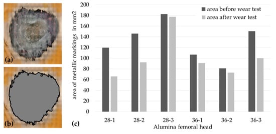 The area of the metallic depositions was measured with a digital microscope. It should be noted that the measurements could be affected by reflections on the smooth surface. This undesirable effect was largely minimized by the use of diffusers. Nevertheless, the smallest metallic deposition could not be included in the survey of the transferred areas, and only the areas around the main articulated area were included. Another limitation was the selection of the femoral ceramic heads. Although care was taken to use heads with the same amount of metallic contamination, not all ceramic heads showed the same expansion or thickness distribution of metallic depositions. Furthermore, femoral heads from left and right total hips were used. The influence should be minimized by aligning the metallic depositions in the mainly loaded area. To obtain complete comparability, wear simulations with unused ceramic heads after standardized metallic deposition might represent a suitable alternative. Since the material composition of the metallic deposition was not known, this should be determined in further investigations by means of energy-dispersive X-ray spectroscopy (EDX). The measured extent of the metallic depositions was similar to the extent already described by Dorlot et al. [], which ranged from 5 to 850 mm2, and by Affatato et al. [], which ranged from 29.6 to 573.6 mm2, on ceramic heads. The measured areas on the heads before and after wear testing are not significantly different. However, the statistical significance of this test is only partially meaningful, because the thickness or volume of the metallic depositions could not be measured in this study. Furthermore, the non-significant decrease in the deposition area indicates that the removal of the metallic volume could have a significant influence on the wear rate. The reduction of metallic depositions was apparent (Figure 3), especially for heads 28-1 and 28-2. One explanation for the difference could be the thinner metallic deposit on both heads as opposed to head 28-3. A reduction in the deposited metallic amount on the head surface causes the release of metallic depositions in the form of metal particles and metal ions, which indicates the presence of third-body particles in the joint space and surrounding tissue. The correlation between the volume deviation of the metallic depositions and the wear rate of the polyethylene liner may confirm this relationship. Furthermore, the thickness and extent of the metallic dispositions may depend on the lifetime of the implant in situ.