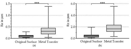 Since the head size did not significantly influence the roughness Ra (p = 0.643) and the maximum height Rz (p = 0.689), the comparison of the original surface and metal transfer was based on all six retrieved heads. The Mann–Whitney U test was used for statistical evaluation, as the recorded roughness values for Ra and Rz did not show a Gaussian distribution.