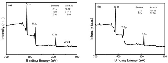 XPS spectra of TiO2 nanotube array surface: (a) Zr4+ doped; (b) undoped.