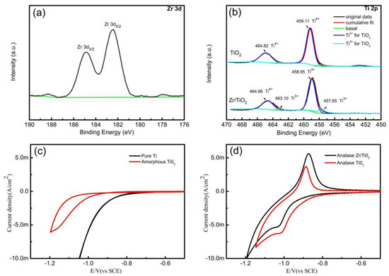 XPS spectra of undoped and Zr4+ doped TiO2 nanotube array surface: (a) Zr 3d, (b) Ti 2p; CVs of different electrodes in 2 mol·L−1 HCl solution (scanning rate: 20 mV·s−1): (c) pure titanium and amorphous TiO2 nanotube array electrode; (d) undoped and Zr4+ doped anatase TiO2 nanotube array electrode.