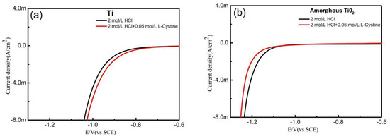 As one of the most studied catalytic materials, TiO2 has an important role in the field of catalysis [5,6,7,8,9,10,11]. Skúlason et al. [12] discussed the role of transition metal oxides in the electrocatalytic reduction of N2 by using density functional theory (DFT) calculations. Hirakawa et al. [13] reported the role of oxygen vacancies and Ti3+ in TiO2 in the photocatalytic reduction of N2. In order to enhance the catalytic activity of TiO2, doping metal elements are used to increase the vacancies and defects in the TiO2 crystal structure [14,15,16,17]. At present, most of the correlative research in this field mainly focuses on the photocatalysis of TiO2. However, there are relatively few studies on its electrocatalysis, especially regarding electrocatalytic reduction. Recently, Cao et al. [18,19] reported in detail that a Zr4+-doped TiO2 electrode can efficiently reduce N2 through electrocatalysis. This provides a feasible idea from which we can design a TiO2 nanotube array electrode with a high electrocatalytic reduction activity for reducing L-cystine. Moreover, considering the better stability of titanium and the existence of the oxygen vacancies and Ti3+ in the anatase TiO2, the TiO2 nanotube array electrode might also possess good potential in the field of electrocatalytic reduction.