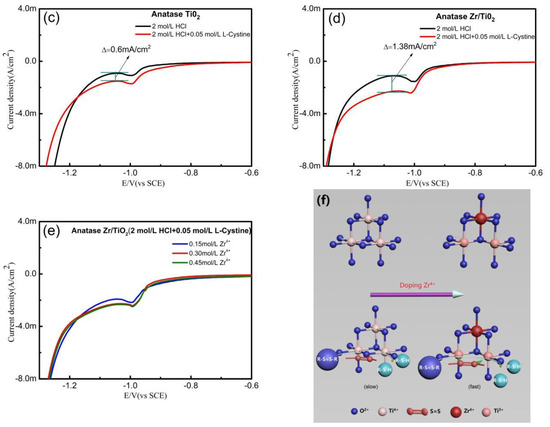 Linear sweep voltammetry (LSV) curves of different electrodes in 2 mol·L−1 HCl or 2 mol·L−1 HCl + 0.05 mol·L−1 L-cystine solutions (scan rate: 5 mV·s−1): (a) pure titanium, (b) amorphous TiO2 nanoarray tube, (c) anatase TiO2 nanoarray tube, and (d) anatase Zr/TiO2 nanotube array electrode; (e) the influence of concentrations of Zr(NO3)4 solution in chemical immersion process; (f) schematic illustration of electrocatalytic reduction mechanism of the anatase Zr/TiO2 nanotube array electrode for L-cystine.