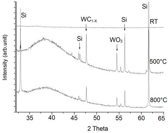 Before annealing, the WC/C coating showed its amorphous character with nanostructured morphology (Figure 11). Phase analysis of the coating after annealing at a temperature of 500 °C is referring to its crystal character. The carbide phase of WC1−x and WO3 and a wide amorphous peak are present in the coating. A similar character is shown by an RTG recording after annealing at a temperature of 800 °C. Maximums of amorphous and carbide WC1−x and oxidic WO3 decreased. A glassy amorphous structure can be shown by using a cross-sectional view, which is in accordance with Reference [5], with a suggestion of the creation of crystal structure (Figure 9f).