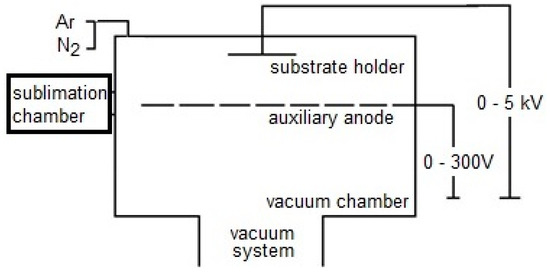 A ZIP 12 device was used for deposition of the WC/C coating with sublimation chamber (Scheme 1). The PECVD method was used with direct current. Moreover, the negative electric potential was connected to electrically conductible substrates against the metallic vacuum chamber of the PVD apparatus. An auxiliary anode was located in the chamber. The substrates were placed onto the substrate holder; the crucible and the precursor were placed into the sublimation chamber and enclosed by a valve between sublimation chamber and vacuum chamber. After the cleaning procedure and ensuring the required yield pressure, which was ca. 10−3 Pa, the deposition of WC/C coating was carried out. Relating to the experiment presented in this paper, argon (Ar) with a purity of 99.999% was used as a carrier gas.