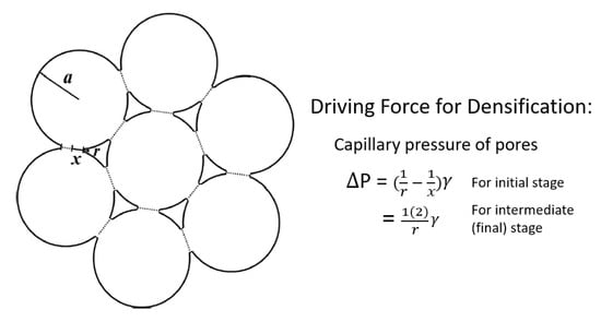 Idealized geometry of a powder compact to illustrate capillary pressure, ΔP, for densification in sintering models [2] (reprinted with permission from Wiley). a: radius of the particle; x: radius of the neck between two particles; r: radius of curvature of the neck (pore); and γ: surface energy.