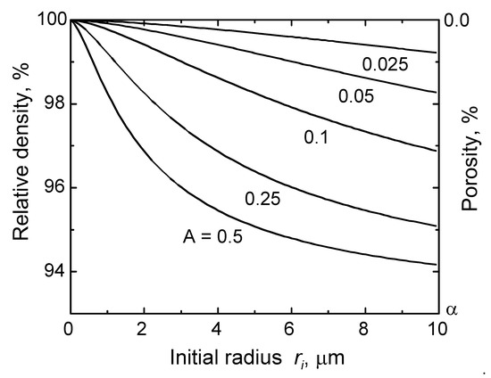 Maximum attainable density versus initial size of isolated pores, with initial porosity of α% [6] (reprinted with permission from Elsevier). The ordinate is scaled by assuming an initial density of 93% of the theoretical value. A = Pi/2γ µm−1.