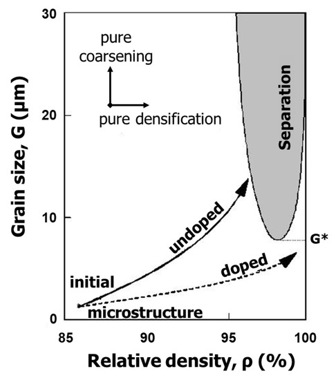 Schematic of the microstructure development map showing two different trajectories of undoped and doped samples [1,14] (reprinted with permission from Elsevier). It is assumed that the densification rate is raised by a factor of 10 by adding a dopant.