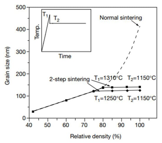 Another technique that modifies the conventional thermal cycle is two-step sintering [28,29]. This technique consists of stepwise sintering at a high temperature for a short period of time, and then at a low temperature for a long period of time, typically the time period of conventional sintering. Grain growth can be much suppressed, as the example in Figure 6 shows [28]. Many investigations have reported the usefulness of two-step sintering, even for liquid-phase sintering [30,31]. The mechanism of two-step sintering seems, however, not yet clearly understood. For two-step liquid-phase sintering, an investigation reported that the mechanism was related to a reduction in the driving force for grain growth due to a change in the grain size distribution after a first-step sintering [31].