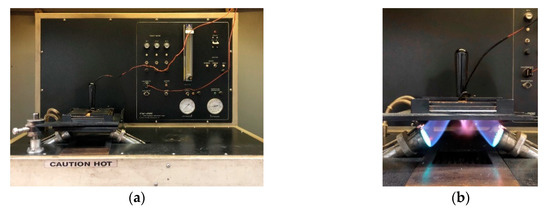 Only Meker burners were activated in this work to produce flame exposure. The fabric specimens were cut with a size of 15 cm × 15 cm in standard cases and the exposed fabric area was 100 cm2 in the center. Flame-exposure duration was determined after pre-experimental testing to be 17 s. This allowed measuring the time needed for second degree burns to occur while maintaining structural integrity of the specimens.