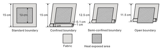 The fabric specimens were cut and sewn based on the boundary conditions to simulate garment aperture structure as shown in Figure 3. The specimens of standard boundary were cut with the size of 15 cm × 15 cm and not folded. The test lengths of confined, semiconfined and open boundary specimens were 15 cm, 12.5 cm and 11.5 cm, respectively, as shown in Figure 2. The specimens were sewn with a 2-cm-wide hem at the bottom, in which the raw-edge-width was 1 cm. The hem was sewn with flame-retardant sewing thread matching the color of fabrics; the stitch density was 10 stitches per 3 cm.