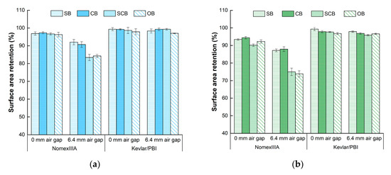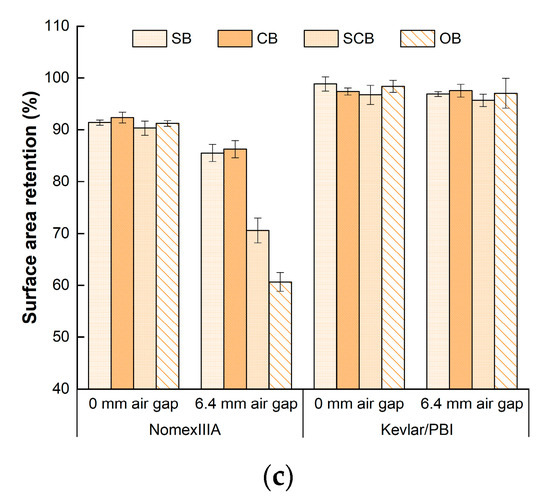 where, is the surface area retention (%); is the surface area of the specimen before flame exposure, m2; and is the surface area of the specimen after flame exposure, m2.