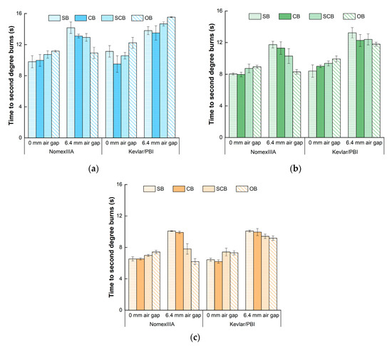 Time-to-second-degree-burns under the heat flux of: (a) 30 kW/m2; (b) 40 kW/m2; (c) 50 kW/m2. SB—standard boundary; CB—confined boundary; SCB—semiconfined boundary; OB—open boundary.