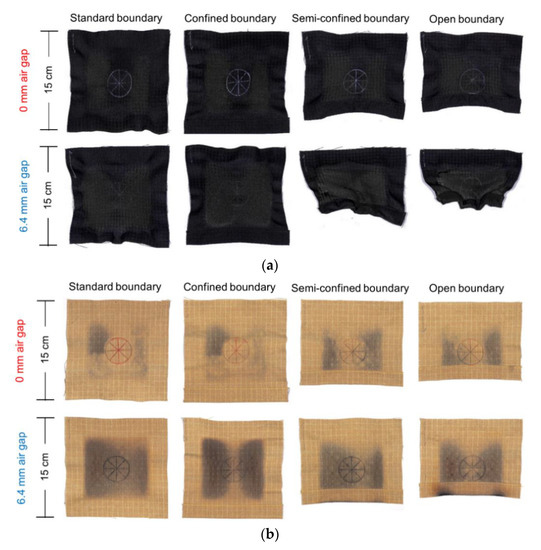 Backside photographs of the specimens after fire exposure under the heat flux of 50 kW/m2: (a) Nomex IIIA specimens. Thermal shrinkage was more severe in the presence of air gap for semiconfined and open boundary conditions; (b) Kevlar/PBI specimens. No significant thermal shrinkage of the specimens, while the area of color fading and carbonization is valid evidenced of the effect of air gap.