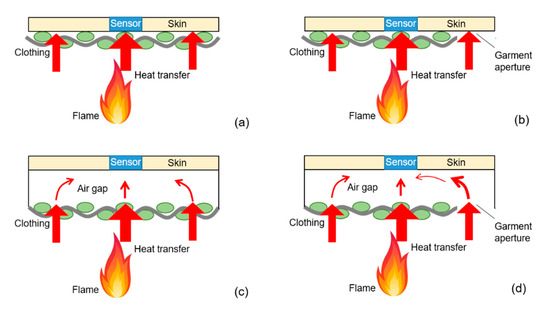 Figure 8b illustrated the heat-transfer process for contact test configuration with garment aperture. Variance analysis indicated that the boundary condition had no significant effects on surface area retention, standardized mass loss and time-to-second-degree-burns under 0-mm-air-gap condition. Although there was garment aperture as shown in Figure 8b, the heat source and heat-transfer mode was similar with Figure 8a. Energy of the flame could transfer to the sensor insulating board directly through the garment aperture, however, the copper sensor was embedded in the center of the board, which was barely affected. Nonetheless, an escalating trend was found for time-to-second-degree-burns from standard to confined, semiconfined and open boundary condition under the contact test configuration. The possible reason was that the sewn hem increased the thickness of the bottom edge of the specimen and produced a tiny air layer between the fabric and sensor, which increased the thermal protective of the specimen. The heat-transfer mechanism for the spaced test configuration was much more complicated, especially for the open boundary condition with garment aperture shown in Figure 8d. Heat partially transferred from burners to the sensor by heat conduction of air, radiation transfer induced by heated fabric, and the radiation energy penetrating through the fabric. Garment aperture was another channel for heat transfer from the burner to the air layer and to the sensor. Therefore, the open boundary condition decreased the thermal protective performance of the fabrics.