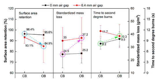 Considering the confined and open boundary can represent the garment aperture structures with or without closures at sleeves, neck and waist, respectively, their effects on surface area retention, standardized mass loss and time-to-second-degree-burns were compared in Figure 9. Apparently, the presence of 6.4-mm air gap enhanced the thermal shrinkage and mass loss, which accelerated the thermal aging and declined the lifetime of the flame-retardant fabrics for both of confined and open boundary conditions. On the contrary, thermal protective performance of the fabrics were improved due to the existence of the 6.4-mm air gap, indicating the importance of balancing the service life and thermal protective performance of the thermal-protective clothing. Compared the snug fit to the standard fit condition, garment without closures at sleeves, neck and waist would significantly increase the thermal shrinkage and mass loss. However, the garment openings would decrease the positive effect of air gap on thermal protective performance. According to Rucker et al. [39], the loose-fitting garments provided a significantly higher level of burn protection. However, they also cautionary noted that garment looseness must be controlled with closures that allowed a snug fit at the collar, cuffs and waist, to avoid the chimney effects on greater injuries.