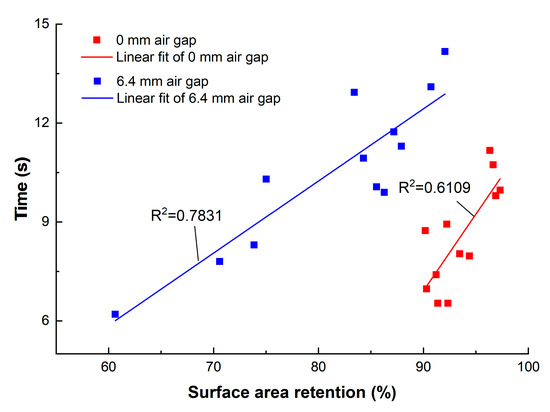 Relationship between the surface area retention and thermal protective performance under 0-mm- and 6.4-mm-air-gap conditions of Nomex IIIA specimens.