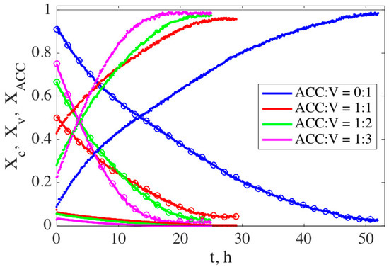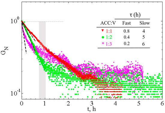To compare the timescale of phase transformations with the timescales of rheology, we use a standard definition of the relaxation time, τ: ln[(m0m)/(mfm0)] = ln[X] = t/τ, that is τ~0.4 tf. The relaxation times are then τACC:V 1:1 = 11 h, τACC:V 1:2 = 9 h, τACC:V 1:3 = 7 h and τACC:V 0:1 = 20 h.