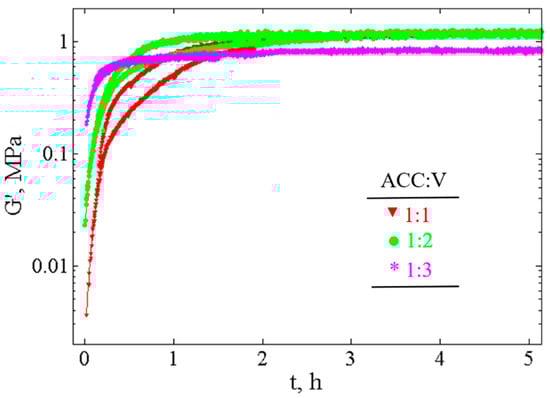 Figure 4. Time evolution of storage modulus, G′, for three different CaCO3 cement compositions (ACC:V 1:1, 1:2 and 1:3) measured at constant frequency, f = 10 Hz, and deformation, γ = 0.003%.