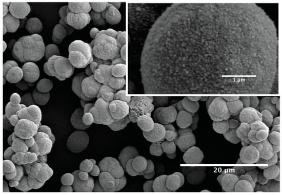 Figure 6. Vaterite at initial stage of phase transformation. Inset: Magnification of a vaterite grain demonstrating the surface roughness consisting of ~100 nm spheres on the 2–5 µm large vaterite grains.