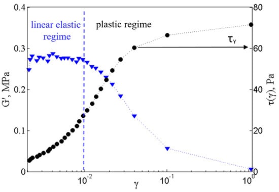 Figure 7. Rheological properties of 1:2 ACC:V suspension of 36% volume fraction. The shear modulus G′ (blue triangle down) and the shear stress τ (black circle) are plotted as a function of the shear strain γ measured through an amplitude sweep at f = 1 Hz. The vertical dashed line delineates the elastic and the plastic regimes. The horizontal plain line indicates the value of the yield stress defined as the value of the shear stress.