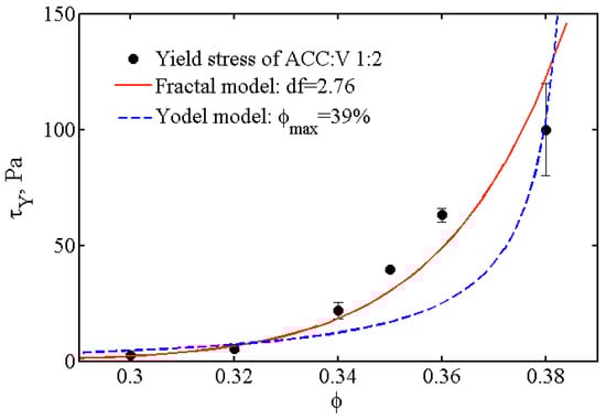 Figure 8. Dependence of the yield stress of ACC:V (1:2) paste with the volume fraction. Comparison of the experimental data with the Yodel model [22] (blue curve) and the fractal model of Shi et al. [24] (red curve).