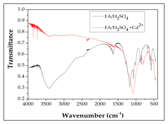 FTIR analysis was employed to establish the functional groups that could provide information concerning the structure of the adsorbent. In Figure 3 the FTIR spectra for FA/H2SO4 and FA/H2SO4+Cd2+ can be seen.