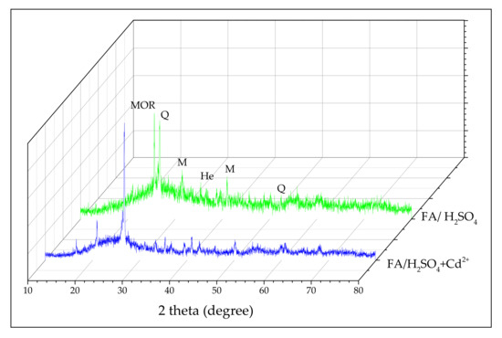 One significant observation is that the results of XRD analysis revealed that quartz (Q) presents the highest intensity—mullite (M) and hematite (He); the mainly crystalline phases of the unmodified fly ash [26] can also be identified in FA/H2SO4. Additionally, FA/H2SO4 shows a prominent peak at 2 theta = 25.63° that can be attributed to modernite (MOR)[Na8(H2O)24] [Si40Al8O96] [35,36]. In the case of FA/H2SO4+Cd2+ the peaks can be observed in minor intensity. On the other hand X-ray diffraction patterns indicate that a large part of the amorphous silica is present in the tested samples.