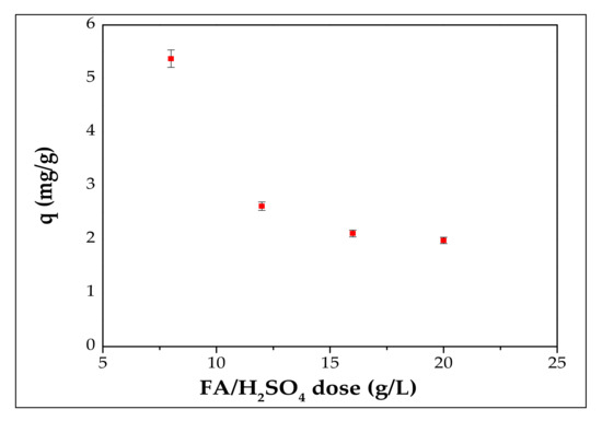 Adsorbent dose should be a parameter studied in the adsorption technique of different pollutants from wastewaters since it has an important role in terms of process economy [38,39]. Determining the optimal dose of the adsorbent was carried out by increasing the FA/H2SO4 dose from 0.2 g/25 mL to 0.5 g/25 mL at an initial concentration of 70 mg/L. The effect of the adsorbent dose through adsorption capacity is presented in Figure 6.