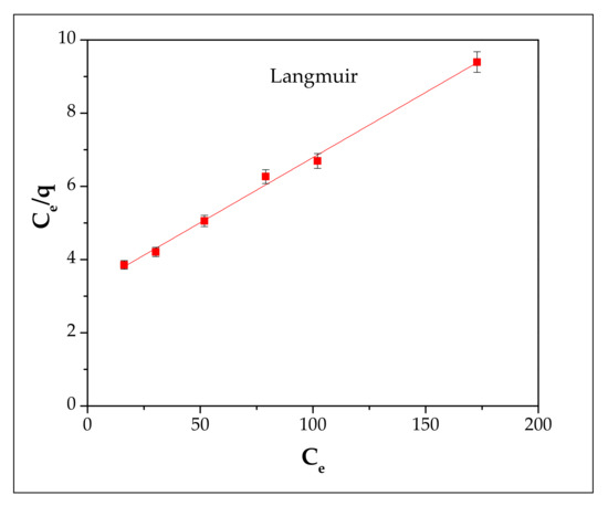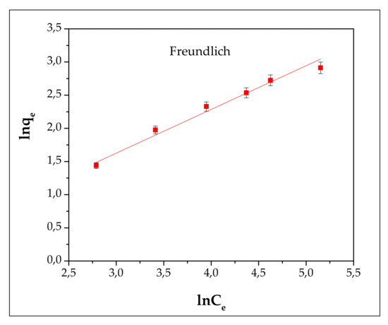 A plot of Ce/q vs. Ce (Langmuir) and lnqe vs. lnCe (Freundlich) enables the determining of the coefficients (Figure 8 and Figure 9 and Table 3).