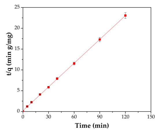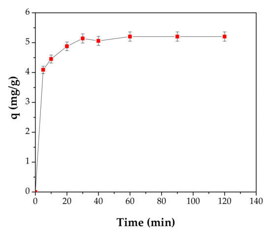 The adsorption capacity at different time intervals (5–120 min) was calculated with Equation (2):