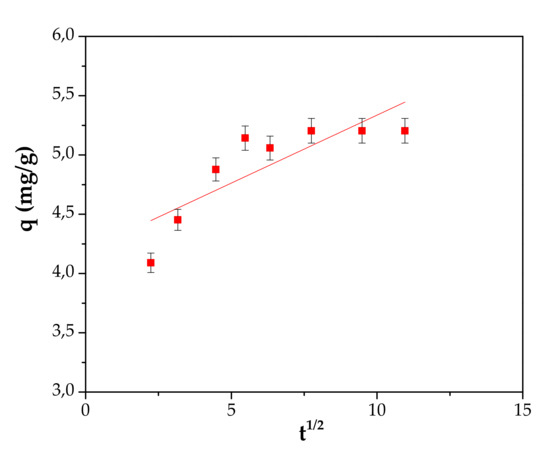 Three kinetic models, the pseudo-first-order model, pseudo-second-order model and intraparticle diffusion model have been developed in order to describe the adsorption kinetic process of Cd2+ onto material, see Figure 11, Figure 12 and Figure 13 and Table 4. A detailed presentation for each model can be consulted in the literature [24,40,41].
