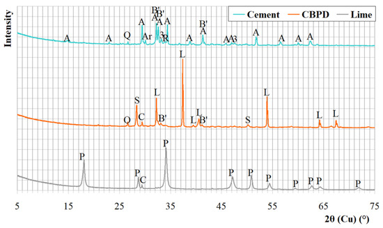 The X-ray patterns of cement CEM I 32.5R, CBPD, and hydrated lime. Designations: A—alite, B’—belite, R—brownmillerite, 3—C3A, Ar—arcanite, Q—quartz, G—gypsum, L—free CaO, S—sylvine, P—portlandite, C—calcite.