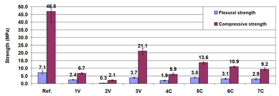 In most cases, the comparison between the 28-day and 56-day tests showed only slight strength changes. It can thus be concluded that the binders tested behaved like ordinary Portland cement binders with the strength increase occurring mainly in a period shorter than 28 days. Generally, the changes taking place after this time resulted in an increase in strength, except for binders 5C and 6C. The observed decrease in the strength of these binders may be related to the progressing concrete degradation due to the influence of chlorides from the CBPD [14,17,45].