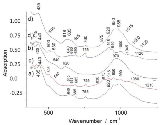 Complete de-hydroxylation requires heating above ~700 °C. Comparison of the IR patterns in Figure 3 shows that the lowest OH content, based on the intensity of the 3670 cm−1 narrow band, is measured for the c and d samples, and the lowest water content is also found for these samples (measured by the lower intensity of the 3200 cm−1 broad band). The 3400 cm−1 component may arise from the clay-based matrix [45] being more or less transformed by the firing. We can expect that the lowest water content is related to a lower porosity and hence to the higher firing temperature, with the mean composition of the shards being rather similar in a first approach. Indeed, the sample d spectrum measured at spot 2 shows a strong and broad ~1010 cm−1 band, consistent with a silicate amorphous phase formed in the reaction. Furthermore, for this sample, it was not possible to observe the fiber bundles by optical and scanning electron microscopy, which is most likely due to the higher degree of reaction between phases.