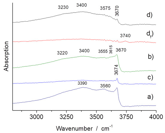 FTIR ATR spectra of samples (a–d) (see Figure 1) in the O-H/H2O spectral range; (df) spectrum recorded on extracted asbestos fibers.