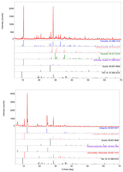 XRPD patterns for samples c (top) and d (bottom). XRPD patterns of indexed phases: antigorite (PDF# 00–007-0417), heated actinolite (PDF# 01-089-5367), quartz (PDF# 00-001-0649), chlorite–serpentine (NR) (PDF# 00-052-1044), crocidolite (riebeckite) (PDF# 00-027-1415), tremolite (PDF# 01-086-1319), orthopyroxene (PDF# 01-076-3331), diopside (PDF# 00-017-0318) and talc 1A (PDF# 01-082-8123) are presented in the form of straight intensity lines at the pattern bottom [21,22,23,24,25,26,27,28,29]. See Appendix A for XRPD patterns of samples a and b.