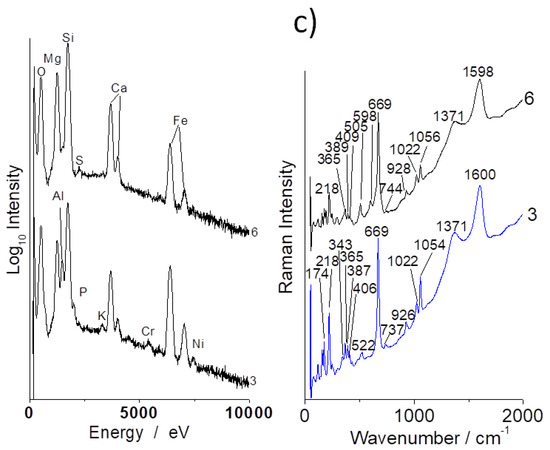 Important differences are observed in the Raman signature recorded in many places of the samples, especially on coarse grains (Figure 6, Figure 7, Figure 8 and Figure 9). The carbon doublet (ca. 1360–1600 cm−1) is observed in all samples, especially in samples a (Figure 7) and c (Figure 8). This carbon can arise from different origins: (i) the transformation of organic residues during the use of the utensils, (ii) the use of carbon-rich clays (clays with organic (humic) acids exhibit a high plasticity) and/or (iii) the firing was undertaken under reducing conditions.