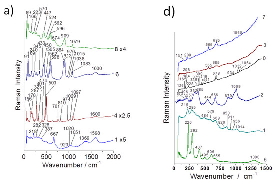 Representative Raman spectra recorded on some spots of samples a (left) and d (right) (see Figure 1).