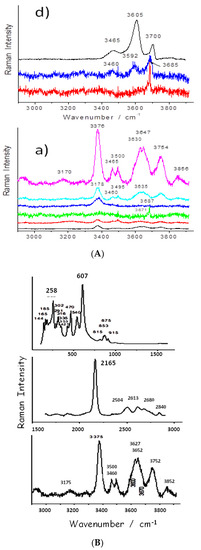 Representative Raman spectra recorded in the 2900–3950 cm−1 range on samples a and d (A, above, see Figure 1). Examples of untransformed grain core are given on the top spectra. Maximum intensity is measured in the center of the biggest grains visible on the cross-section. Details for the spectrum of sample a are given on the bottom (B).