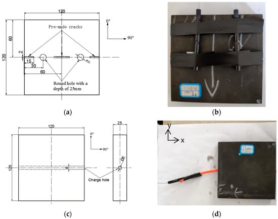 The normal opening charge is to open two through 10 mm diameter holes in the middle of the laminate for charging and to make guide grooves along the 90° direction on both sides of the charging hole, as shown in Figure 1a. During the test, the end of the charging hole was closed with thin copper and desensitized RDX detonating cord was inserted into the charging hole. After charging was completed, the charging hole was sealed with paper, and the flanks of two nonel detonators of the same model were fixed with tape to the center of the two holes, as shown in Figure 1b.