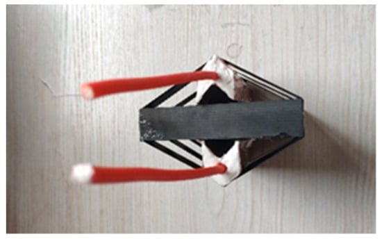 The lateral opening charge was drilled in the thickness direction of the laminate. A 6 mm through-hole was drilled in the 90° direction of the flat plate for charging, as shown in Figure 1c. For charging and detonation convenience, a detonating cord that was 8 cm longer than the composite board was inserted into the lateral through-hole. The flanks of the detonator were fixed, and the detonating cord was extended with tape, as shown in Figure 1d.