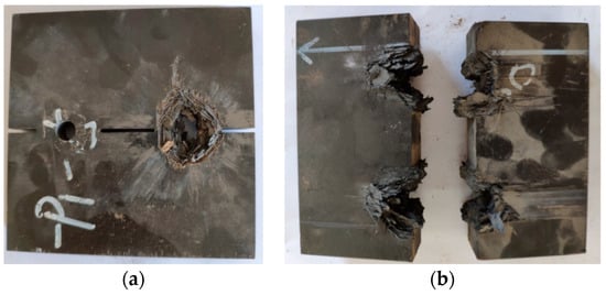 The explosion cut result of the charge in the normal opening is shown in Figure 4. One of the charge holes on the 15 mm thick laminate was not detonated because it was not attached tightly to the main detonation zone of the detonator, and therefore the composite board did not break. Two charge holes on the 25 mm thick laminate were detonated. Fibers around the charge holes were damaged, which damaged the fibers and matrix, and expanded the through-hole to the groove. The laminate broke, and the two broken parts were ~1.3 m apart. The laminate broke because, under this charging structure, the explosion generated a cylindrical shock wave, which propagated from the charging hole to the surroundings, and combined with explosion gas to expand the opening. The prefabricated guide groove expanded and the laminate broke. In [10], the thickness of the composite board was 8.5 mm, and the three normal opening methods did not successfully separate the composite board, because the thickness of the composite plate was too small, and a large amount of the gas generated by explosions escaped in the thickness direction and could not effectively act on the laminated plate. As the shock wave opening effect became smaller, it was difficult to expand the opening to the prefabricated guide groove, and the laminate would not broke. If the laminate is to be separated successfully, the prefabricated guide groove must be expanded to the edge of the charge hole, and at the same time, the plate cannot be broken in advance, which is too difficult to operate, and therefore, for small thickness laminates, this method is difficult to implement. The two fractured plates were 1.3 m apart in this pretest because the explosion shock wave provided a large additional lateral force to the fractured two plates in the fracture direction during the expansion and propagation, which resulted in a long distance after the composite plate was separated. It is difficult to meet the requirement that the laminate breaks only in the containment test without excessive residual speed and fragment splash.
