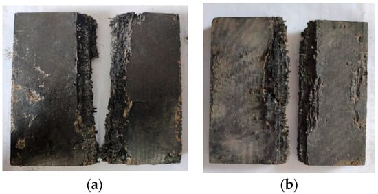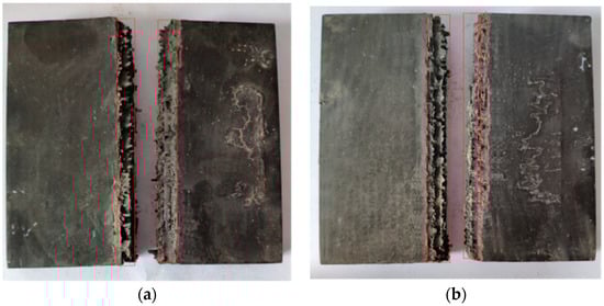 The results of the linear charge-shaped jet cutting are shown in Figure 6. Two laminates of different thicknesses were broken. The two parts of the 15 mm thick laminate are ~0.7 m apart, and the two parts of the 25 mm thick laminate are ~0.4 m apart. After the explosion, a certain degree of damage resulted on the surface of the incisions of the two laminates with different thicknesses. In Figure 7, the area enclosed by the red frame is the damage area of the plate after the laminate was cut. The damage area of the 15 mm thick plate was about 27.9% of the entire sample, and the damage area of the 25 mm thick plate was about 28.36% of the entire sample. This damage meant that a considerable number of additional fragments were produced. Fragments result because the explosion height is not set between the cutters and the laminate, and the jet reaches the laminate before it is formed sufficiently. Large lateral forces result during cutting, which result in a long distance between the two parts after the laminate is separated, causing a large degree of damage to the laminate surface.