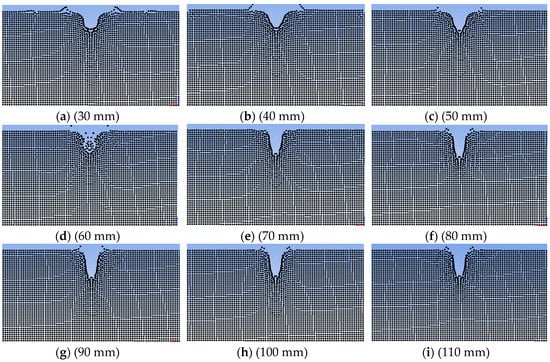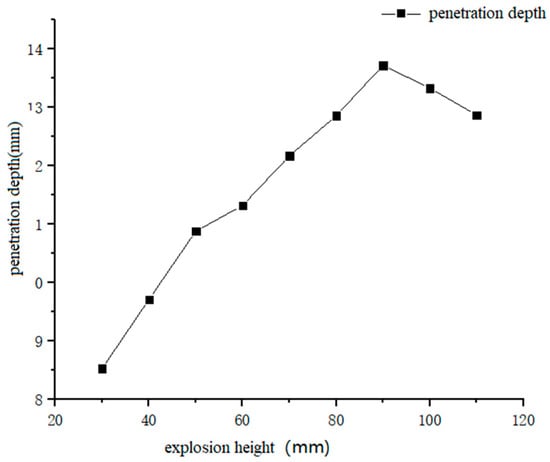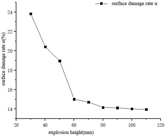 Figure 10 shows the data curve of penetration depth as a function of explosion height. Combined with Figure 11, it can be seen that with an increase in explosion height, the penetration depth increased from 8.53 mm at an explosion height of 30 mm, to 13.72 mm at an explosion height of 90 mm, and then decreased to 12.87 mm at an explosion height of 110 mm. Figure 12 shows the data curve for the degree of surface damage α with explosion height. Combined with Figure 11, it can be seen that with an increase in explosion height, the degree of surface damage α decreased. When the explosion height increased to 80 mm, the decrease rate of α tended to be gentle, and was maintained at ~13.9%. When the explosion height was 90 mm, the jet was fully formed, the velocity of the jet head reached a maximum, and the body of the jet pestle was basically unchanged. The penetration depth of the jet reached a maximum at this point for the same amount of explosive, and damage of the pestle body to the cut surface of the laminate was minimized.