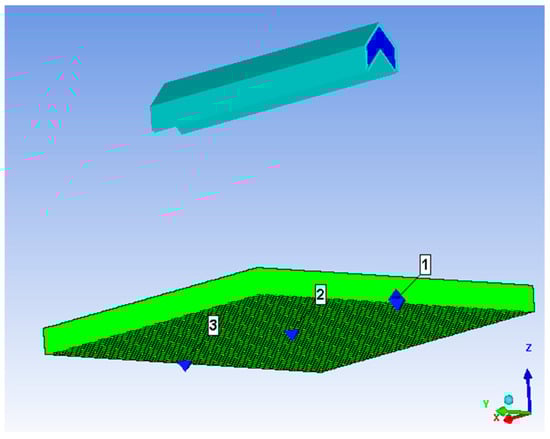 Most numerical simulation research on linear charge-shaped jet cutting uses the Langrage algorithm. Because air is considered in the Langrage algorithm, the contact surface between air and the jet needs to be defined. During the jet forming process, a negative volume appears because of the large deformation of the air grid, which causes the calculation to stop halfway. To ensure continuity and accuracy of the calculation, the sph algorithm was used for calculation. This simulation was used to explore the best explosion height, therefore, the cutting device was arranged only on one side of the target plate with 35 g explosive; a 45 mm thick target plate; an explosion height of 30, 40, 50, 60, 70, 80, 90, 100, and 110 mm; and eight sets of models. Figure 9 shows a numerical modeling diagram, where the blue part is red copper, the green part is RDX (explosive), and the black part is unidirectional carbon fiber reinforced epoxy resin-based composite laminate. We imposed a fixed boundary on the bottom of the laminate in the direction perpendicular to the jet, with a velocity of zero.