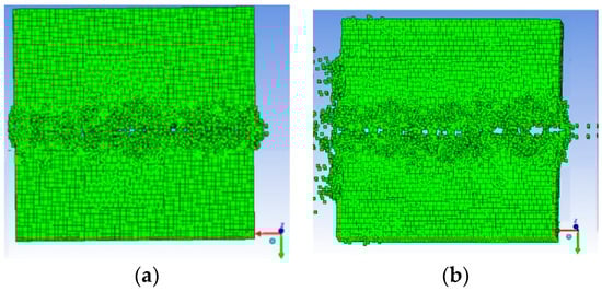 The laminate model length was set to 120 mm, the width was set to 120 mm, and the thickness was increased from 15 mm by 2 mm to 25 mm, with six model sets. The cutter length was set to 120 mm and the width was set to 15 mm. The amount of explosive was adjusted by adjusting the shell height. The cutter was placed symmetrically on the front and back of the laminate. Because the model was symmetrical along the thickness direction, to save calculation time, the half-plane symmetric model was used for modeling [19,20], and the default boundary condition of the software was the symmetric boundary condition. The simulation model is shown in Figure 13.